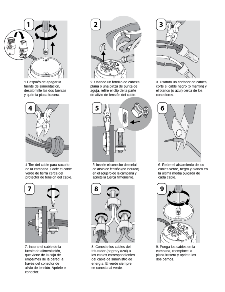 ¡¡¡ADVERTENCIA!!! No intente cablear (cable permanente) un triturador si no sabe lo que está haciendo. Podría anular la garantía o morir por descarga eléctrica.