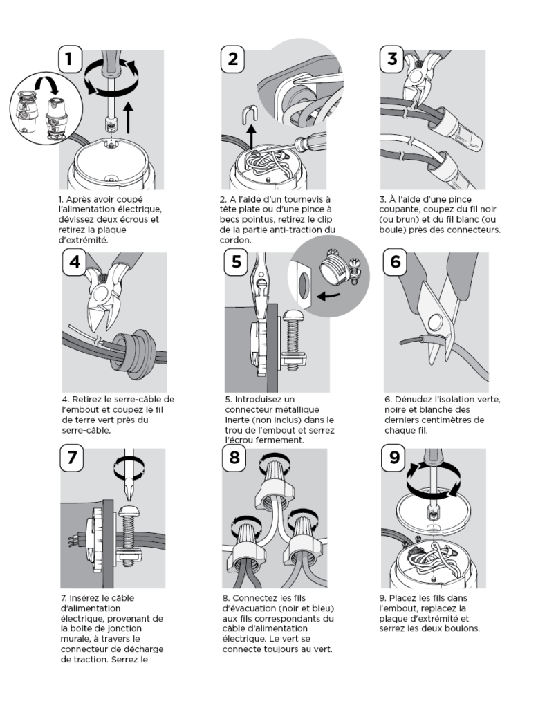 ATTENTION!!! N'essayez pas de câbler (fil permanent) un broyeur si vous ne savez pas ce que vous faites. Vous pourriez annuler votre garantie ou mourir par choc électrique.